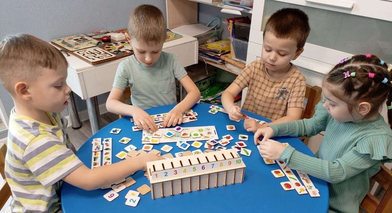 Четверо детей за круглым столом. В центре — деревянный ящик-сортёр с цифрами от 1 до 10. Вокруг — десятки фишек с числами, фруктами, животными и фигурами.